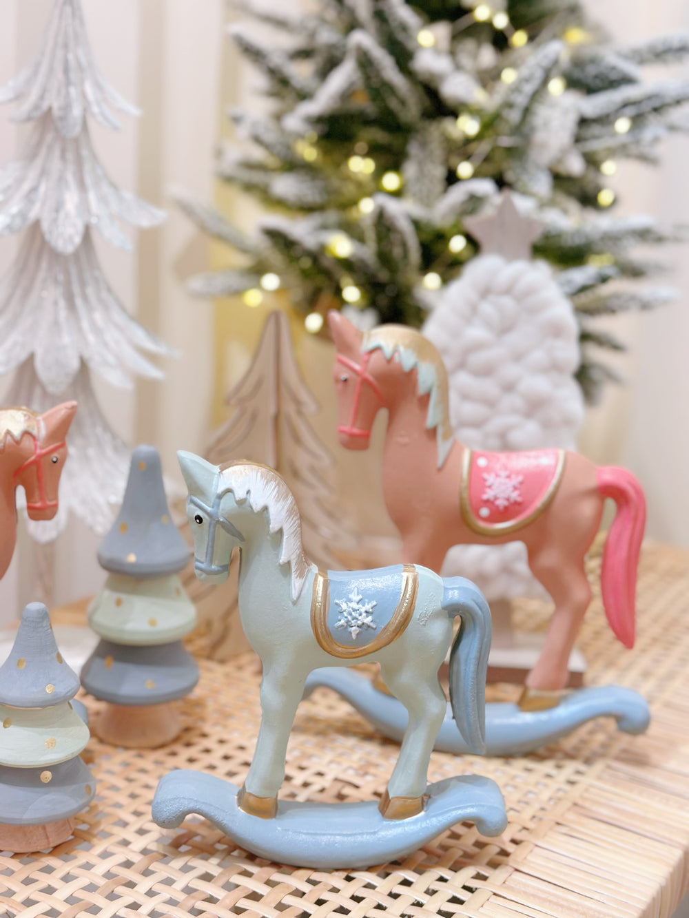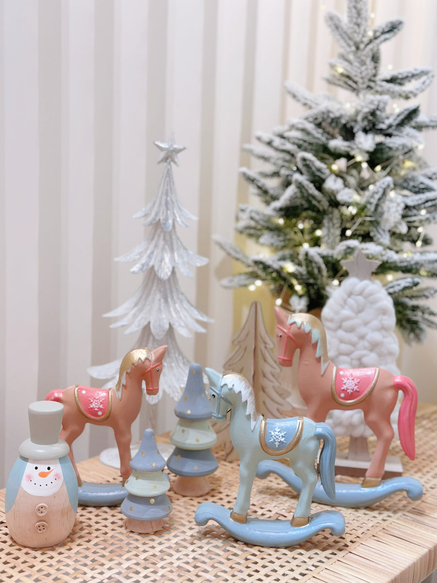 The carefully chosen pastel palette evokes a sense of peaceful snowfall at dusk, with the soft colours reflecting the tranquility of holiday evenings spent with loved ones. Each ornament, from the nostalgic rocking horses to the stylised trees and friendly penguins, embodies a return to classic, rustic decor.